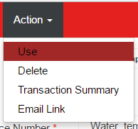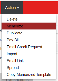 Open the memorized transaction, hover over the 'Action' menu and select 'Use'. Make the necessary updates, including Invoice Number, Date, and Amount, then Save or Approve the Invoice to complete the transaction.