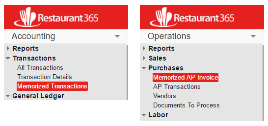 To manually use a Memorized Transaction, navigate to the 'Memorized Transactions' list in the 'Transaction' section of the Accounting Module and the 'Memorized AP Invoice' list in the 'Purchases' section of the Operations Module