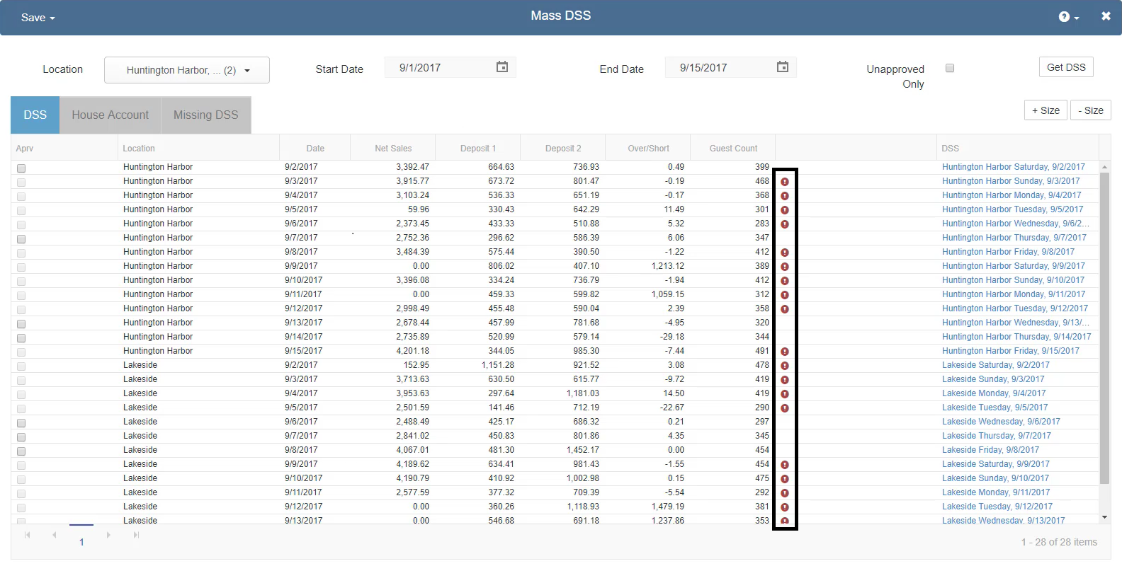 If the DSS has any issues, including unmapped POS Accounts, or unassigned Paid Outs and House Accounts, a warning will appear in the Alert column. Any DSS with the exclamation icon cannot be approved until the warning is cleared. For these DSSs the Approve checkbox will remain greyed out until the warning disappears and the issue is resolved.