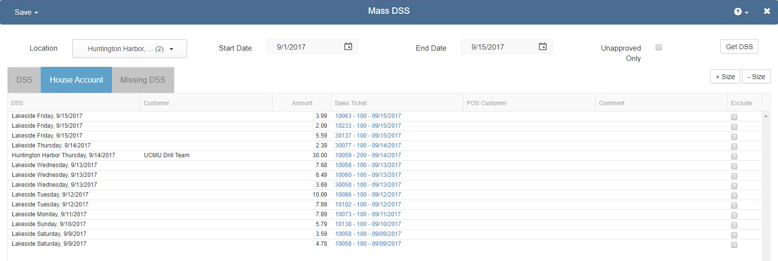 All House Account transactions will be listed for review here. If the only issue preventing the Approval of a DSS is an unassigned House Account, you don't need to open the full DSS record as you can assign Customers or exclude sales tickets using the 'House Account' tab. Click in the Customer column to select and assign the AR Customer, or check the 'Exclude' checkbox to remove this sales ticket from the 'Uninvoiced House Accounts' list.