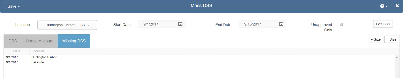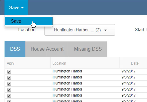 In order to get the Sales and Labor data from the DSS to be approved and post to your General Ledger through the DSS Journal Entries, the DSS itself must first be approved. DSSs can be approved one by one, on the DSS record, or in batches using the Mass DSS Review screen. Hover over the 'Account' menu and select 'Mass DSS' to begin